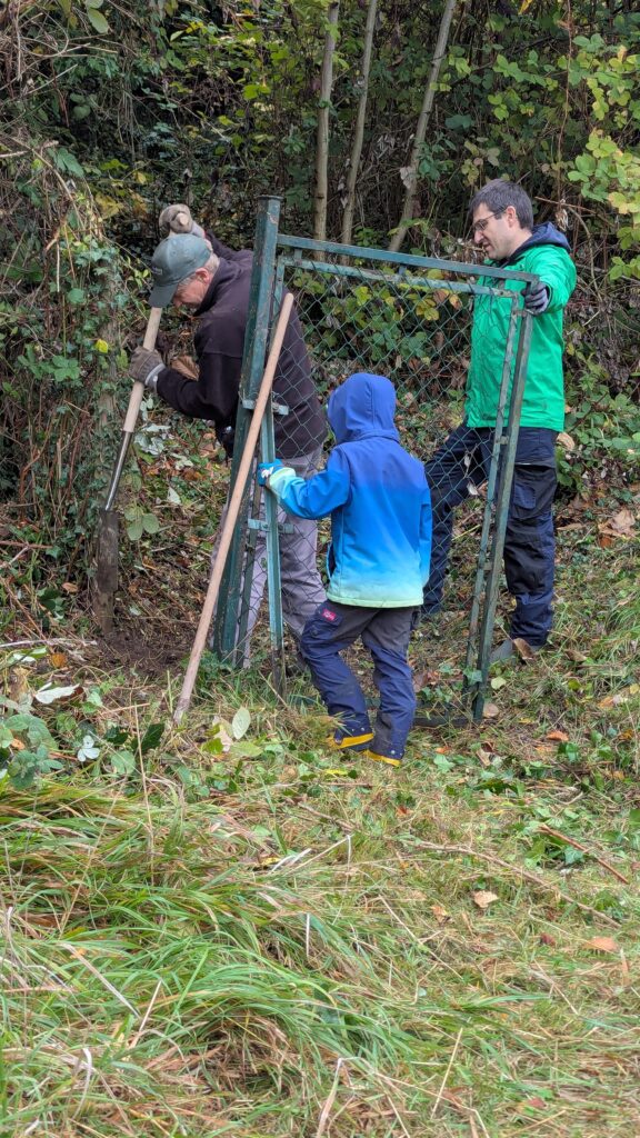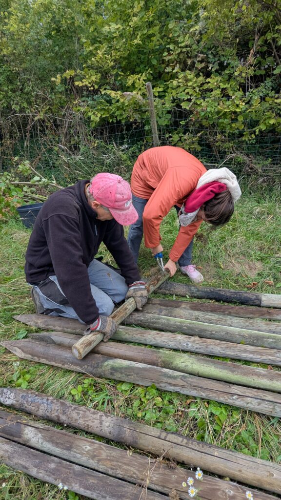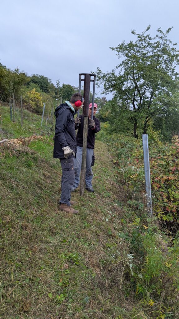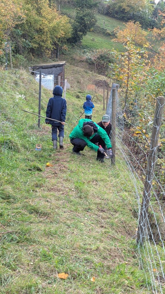 Oktober 2025: Wir bauen einen Zaun, um den Waldgarten vor Rehverbiss zu schützen. Dafür wird gemäht; dann werden alte Weinbergsstickel von Nägeln befreit und als Pfosten gesetzt; zuletzt wird der Zaun angebracht.