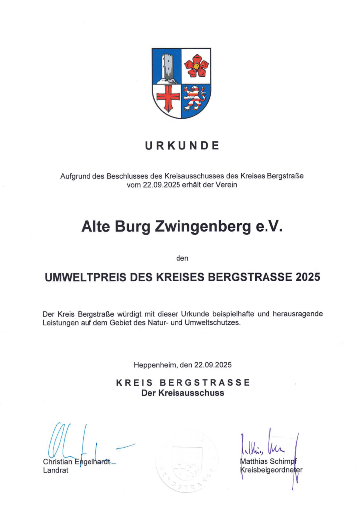 8. November 2025: Der Verein Alte Burg Zwingenberg e.V. erhält (neben drei anderen Preisträgern) den Umweltpreis des Kreises Bergstraße 2025 für seine „beispielhafte[n] und herausragende[n] Leistungen auf dem Gebiet des Natur- und Umweltschutzes“.